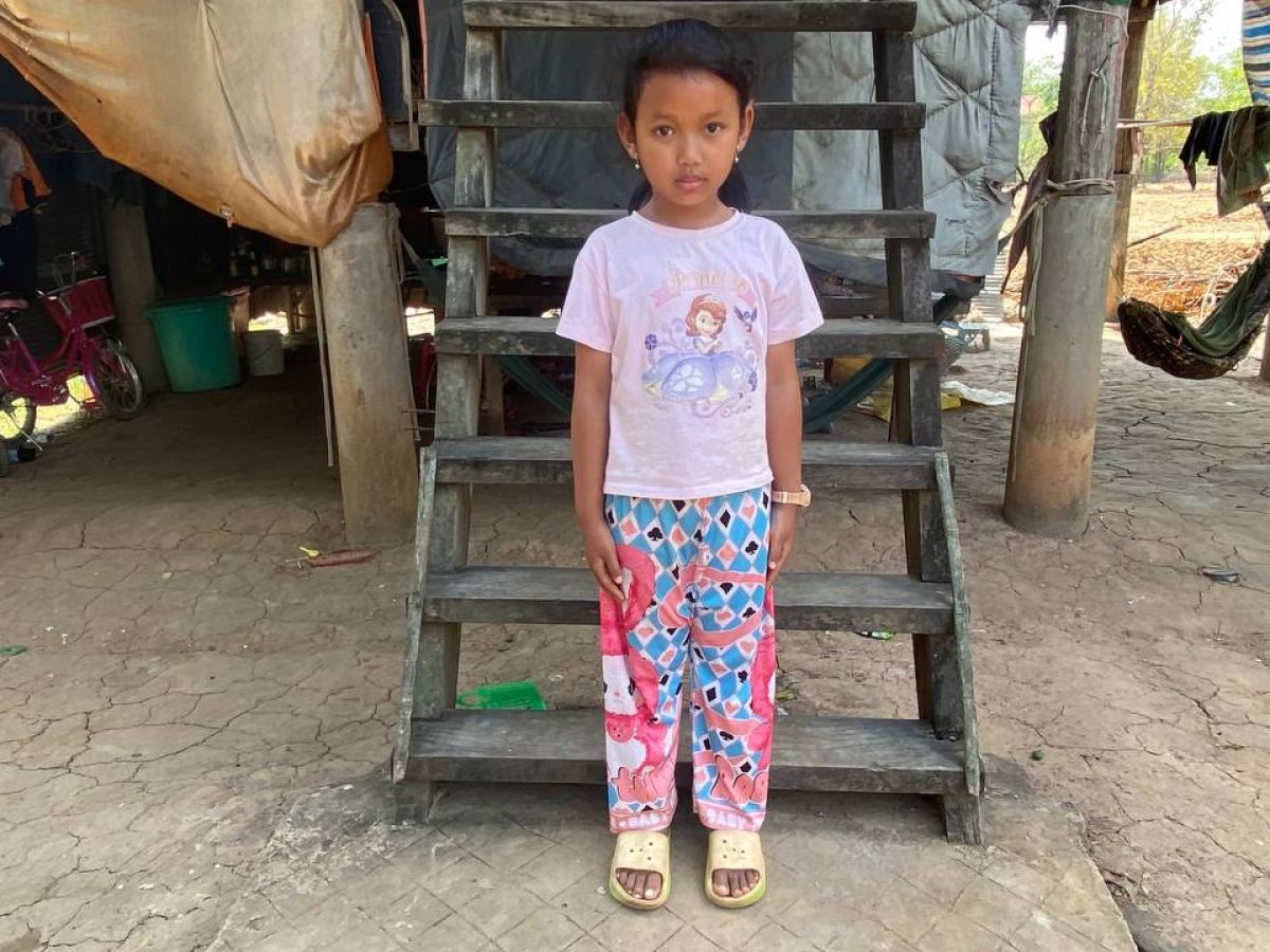 Khouch Savin is an 8-year-old girl studying in Grade 3. She received a school uniform from a relative so she could attend school. Her father works as a village laborer, earning around US$150 per month (approximately SGD 203), while her mother is sick and unable to work. The father’s income is used to support five family members, including sending two children to school, but it is far from enough to meet their basic needs. Due to their financial hardship, the family receives government assistance of 54,000 riels per month (approximately SGD 18).